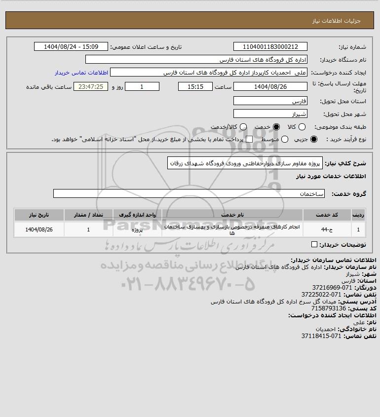 تلفن:5- 88349670 (021) فکس: 88349673 (021) Website: www.ParsNamadData.com E-mail: Info@ParsNamadData.com استعلام پروژه مقاوم سازی دیوارحفاظتی ورودی فرودگاه شهدای زرقان