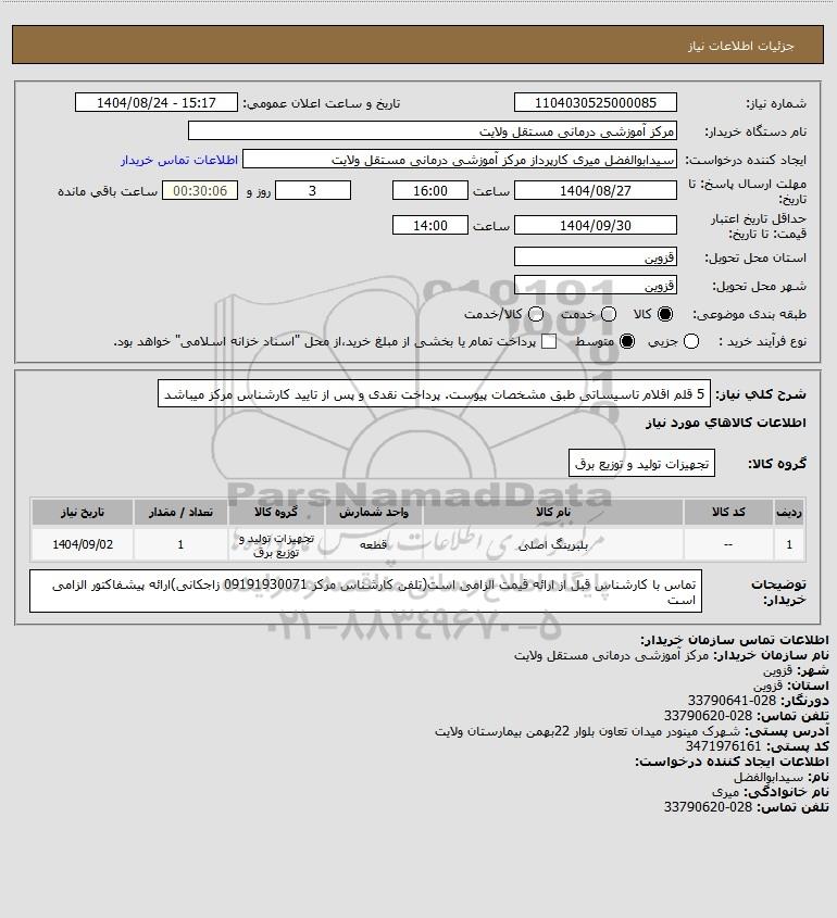 تلفن:5- 88349670 (021) فکس: 88349673 (021) Website: www.ParsNamadData.com E-mail: Info@ParsNamadData.com استعلام 5 قلم اقلام تاسیساتی طبق مشخصات پیوست. پرداخت نقدی و پس از تایید کارشناس مرکز میباشد