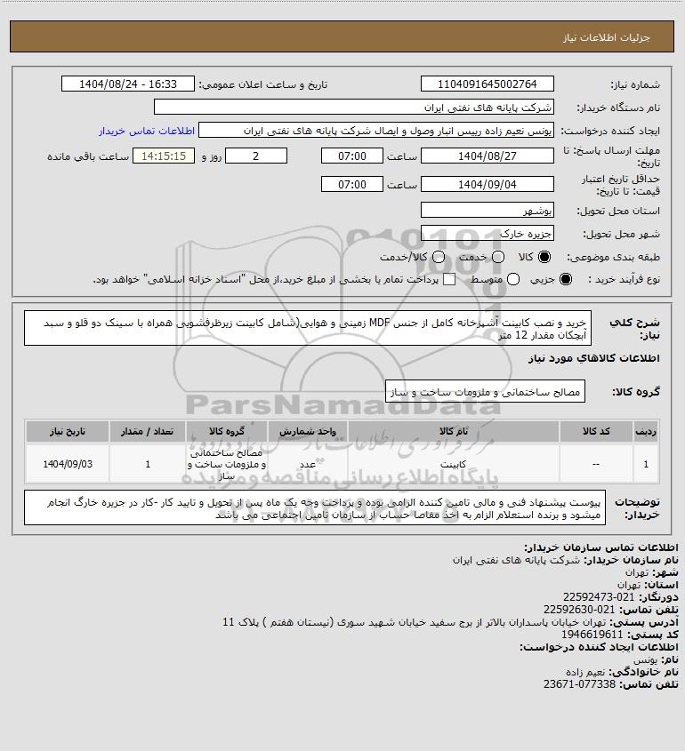 تلفن:5- 88349670 (021) فکس: 88349673 (021) Website: www.ParsNamadData.com E-mail: Info@ParsNamadData.com استعلام خرید و نصب کابینت آشپزخانه کامل از جنس MDF زمینی و هوایی(شامل کابینت زیرظرفشویی همراه با سینک دو قلو و سبد آبچکان مقدار 12 متر