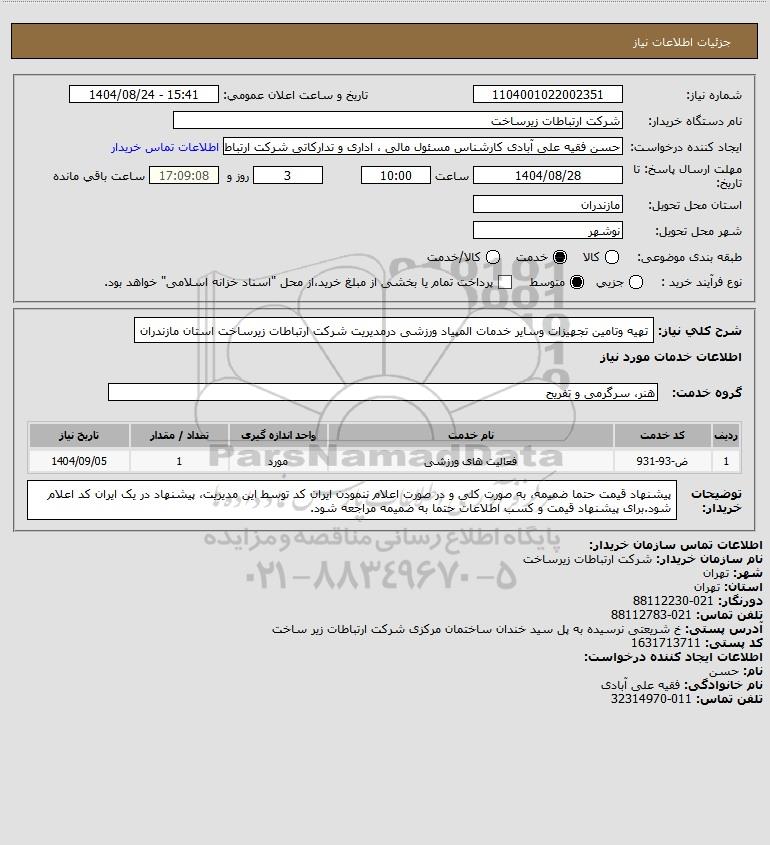 تلفن:5- 88349670 (021) فکس: 88349673 (021) Website: www.ParsNamadData.com E-mail: Info@ParsNamadData.com استعلام تهیه وتامین تجهیزات وسایر خدمات المپیاد ورزشی درمدیریت شرکت ارتباطات زیرساخت استان مازندران