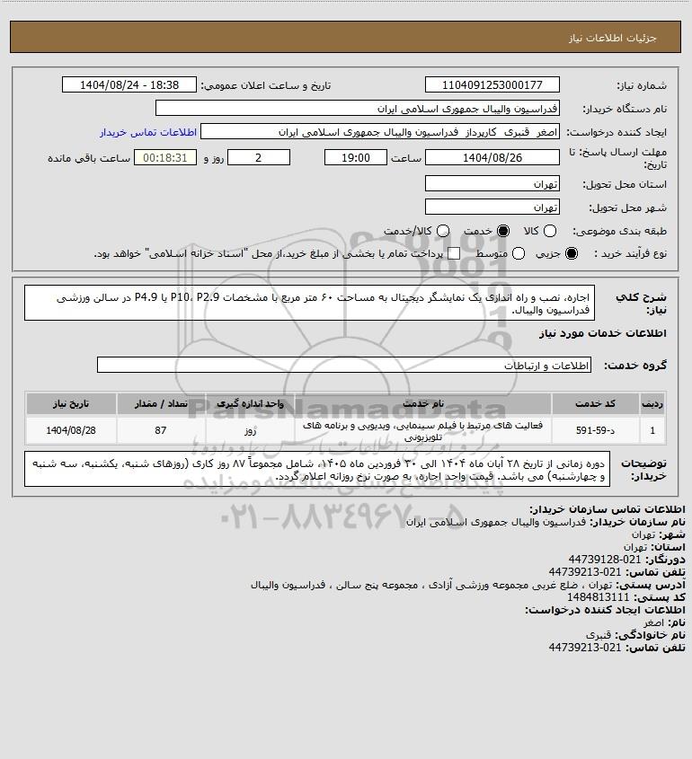 تلفن:5- 88349670 (021) فکس: 88349673 (021) Website: www.ParsNamadData.com E-mail: Info@ParsNamadData.com استعلام اجاره نصب و راه اندازی یک نمایشگر دیجیتال به مساحت ۶۰ متر مربع با مشخصات P10 P2.9 یا P4.9 در سالن ورزشی فدراسیون والیبال.