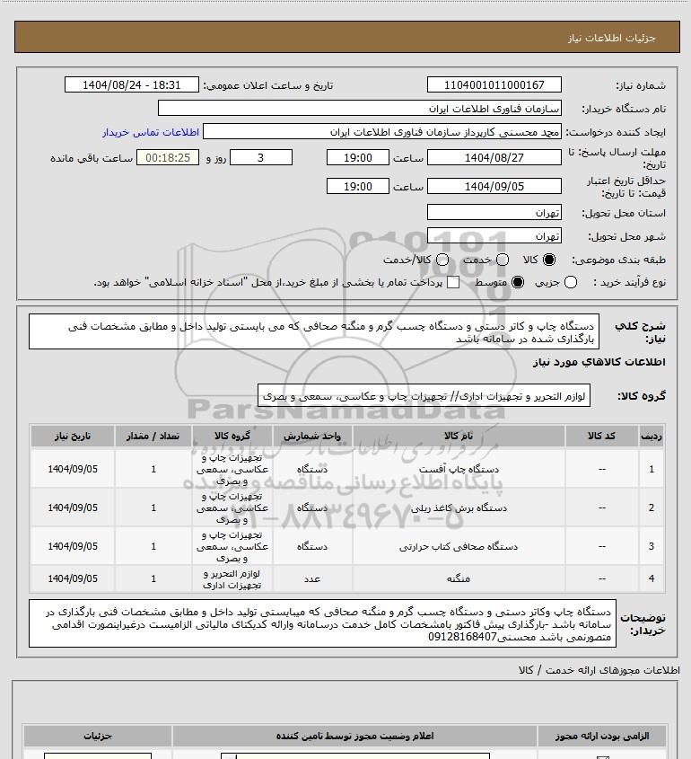 تلفن:5- 88349670 (021) فکس: 88349673 (021) Website: www.ParsNamadData.com E-mail: Info@ParsNamadData.com استعلام دستگاه چاپ و کاتر دستی و دستگاه چسب گرم و منگنه صحافی که می بایستی تولید داخل و مطابق مشخصات فنی بارگذاری شده در سامانه باشد