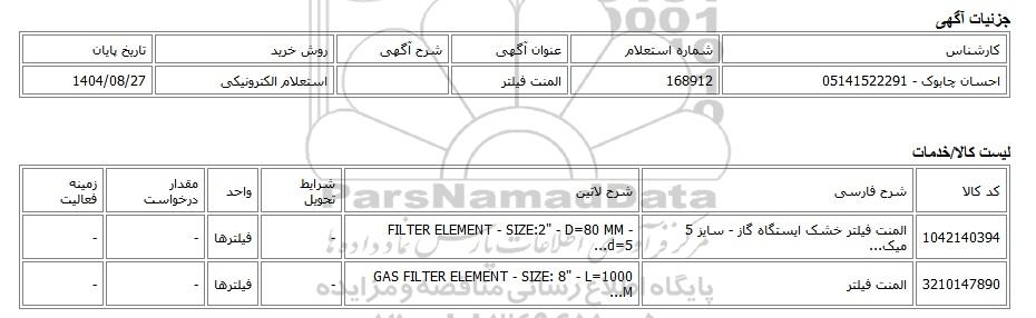 تلفن:5- 88349670 (021) فکس: 88349673 (021) Website: www.ParsNamadData.com E-mail: Info@ParsNamadData.com استعلام الکترونیکی المنت فیلتر