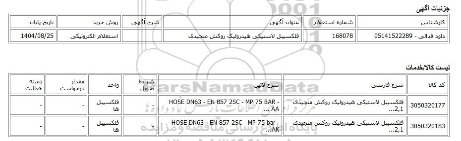 تلفن:5- 88349670 (021) فکس: 88349673 (021) Website: www.ParsNamadData.com E-mail: Info@ParsNamadData.com استعلام الکترونیکی فلکسیبل لاستیکی هیدرولیک روکش منجیدی