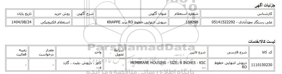 تلفن:5- 88349670 (021) فکس: 88349673 (021) Website: www.ParsNamadData.com E-mail: Info@ParsNamadData.com استعلام الکترونیکی درپوش انتهایی خطوط RO برند KNAPPE