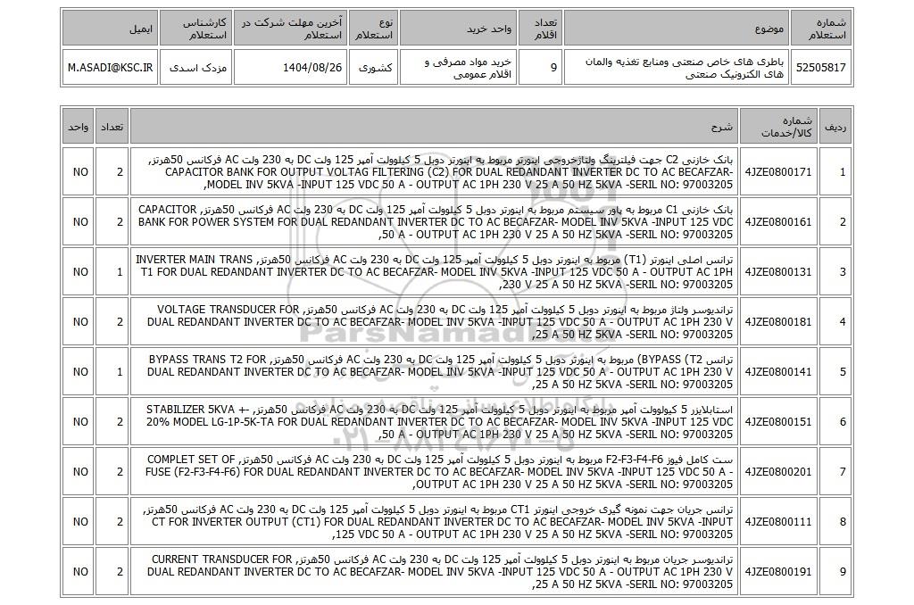 | 9 | 4JZE0800191 | تراندیوسر جریان مربوط به اینورتر دوبل 5 کیلوولت آمپر 125 ولت DC به 230 ولت AC فرکانس 50هرتز,