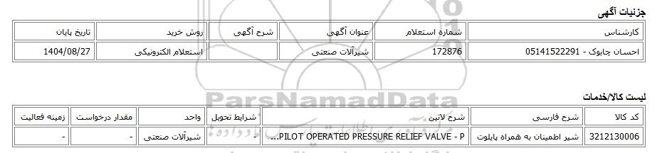 تلفن:5- 88349670 (021) فکس: 88349673 (021) Website: www.ParsNamadData.com E-mail: Info@ParsNamadData.com استعلام الکترونیکی شیرآلات صنعتی