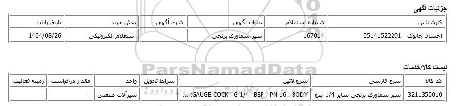 تلفن:5- 88349670 (021) فکس: 88349673 (021) Website: www.ParsNamadData.com E-mail: Info@ParsNamadData.com استعلام الکترونیکی شیر سماوری برنجی