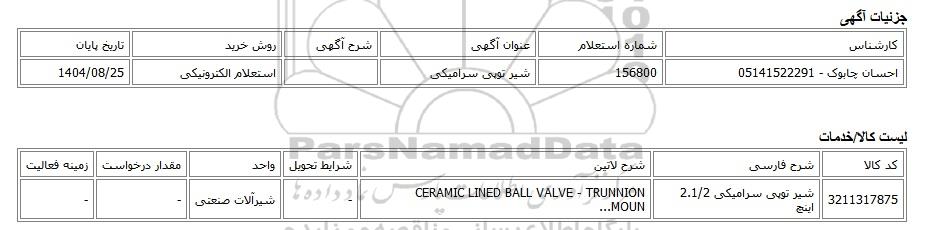 تلفن:5- 88349670 (021) فکس: 88349673 (021) Website: www.ParsNamadData.com E-mail: Info@ParsNamadData.com استعلام الکترونیکی شیر توپی سرامیکی
