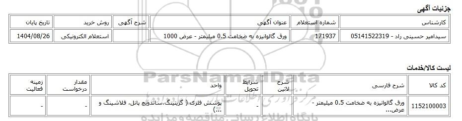 تلفن:5- 88349670 (021) فکس: 88349673 (021) Website: www.ParsNamadData.com E-mail: Info@ParsNamadData.com استعلام الکترونیکی ورق گالوانیزه به ضخامت 0.5 میلیمتر - عرض 1000