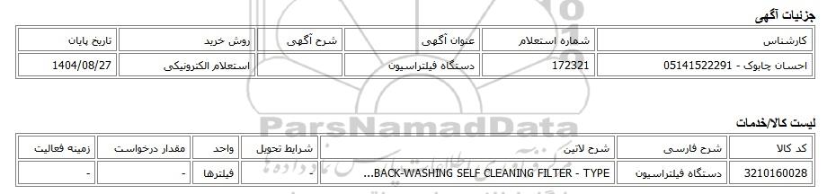 تلفن:5- 88349670 (021) فکس: 88349673 (021) Website: www.ParsNamadData.com E-mail: Info@ParsNamadData.com استعلام الکترونیکی دستگاه فیلتراسیون