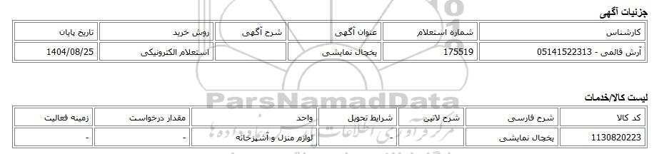 تلفن:5- 88349670 (021) فکس: 88349673 (021) Website: www.ParsNamadData.com E-mail: Info@ParsNamadData.com استعلام الکترونیکی یخچال نمایشی
