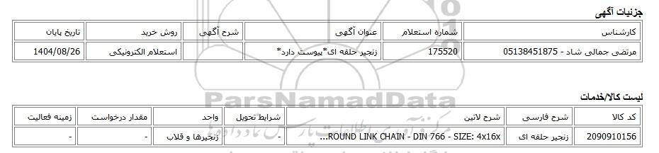 تلفن:5- 88349670 (021) فکس: 88349673 (021) Website: www.ParsNamadData.com E-mail: Info@ParsNamadData.com استعلام الکترونیکی زنجیر حلقه ای*پیوست دارد*