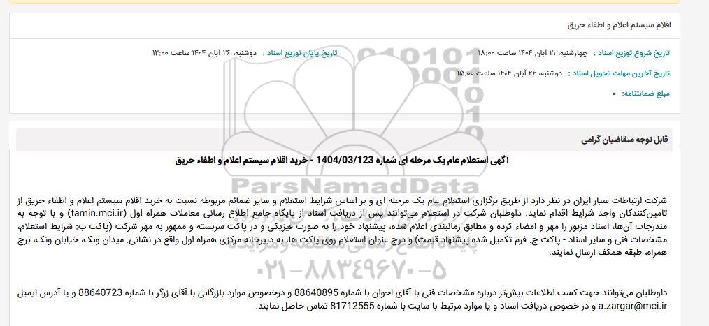 شرکت ارتباطات سیار ایران در نظر دارد از طریق برگزاری استعلام عام یک مرحله ای و بر اساس شرایط استعلام و سایر ضمائم مربوطه نسبت به خرید اقلام سیستم اعلام و اطفاء حریق از تامینکنندگان واجد شرایط اقدام نماید. داوطلبان شرکت در استعلام میتوانند پس از دریافت اسناد از پایگاه جامع اطلاع رسانی معاملات همراه اول (tamin.mci.ir) و با توجه به مندرجات آنها، اسناد مزبور را مهر و امضاء کرده و مطابق زمانبندی اعلام شده، پیشنهاد خود را به صورت فیزیکی و در پاکت سربسته و ممهور به مهر شرکت (پاکت ب: شرایط استعلام، مشخصات فنی و سایر اسناد - پاکت ج: فرم تکمیل شده پیشنهاد قیمت) و درج عنوان استعلام روی پاکت ها، به دبیرخانه مرکزی همراه اول واقع در نشانی: میدان ونک، خیابان ونک، برج همراه، طبقه همکف ارسال نمایند.