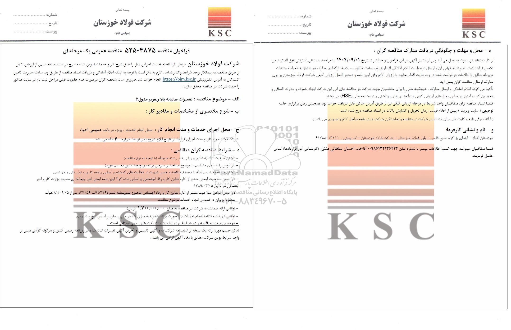 شرکت فولاد خوزستان در نظر دارد انجام فعالیت اجرایی ذیل را طبق شرح کار و خدمات تدوین شده مندرج در اسناد مناقصه پس از ارزیابی کیفی از طریق مناقصه به پیمانکار واجد شرایط واگذار نماید. لازم به ذکر است با توجه به اینکه اعلام آمادگی و دریافت اسناد مناقصه از طریق وب سایت مدیریت تامین کنندگان به آدرس الکترونیکی https://pim.ksc.ir انجام خواهد شد. ضروری است مناقصه گران در صورت عدم عضویت قبلی مراحل ثبت نام در سایت مذکور را جهت شرکت در مناقصه محقق سازند .
