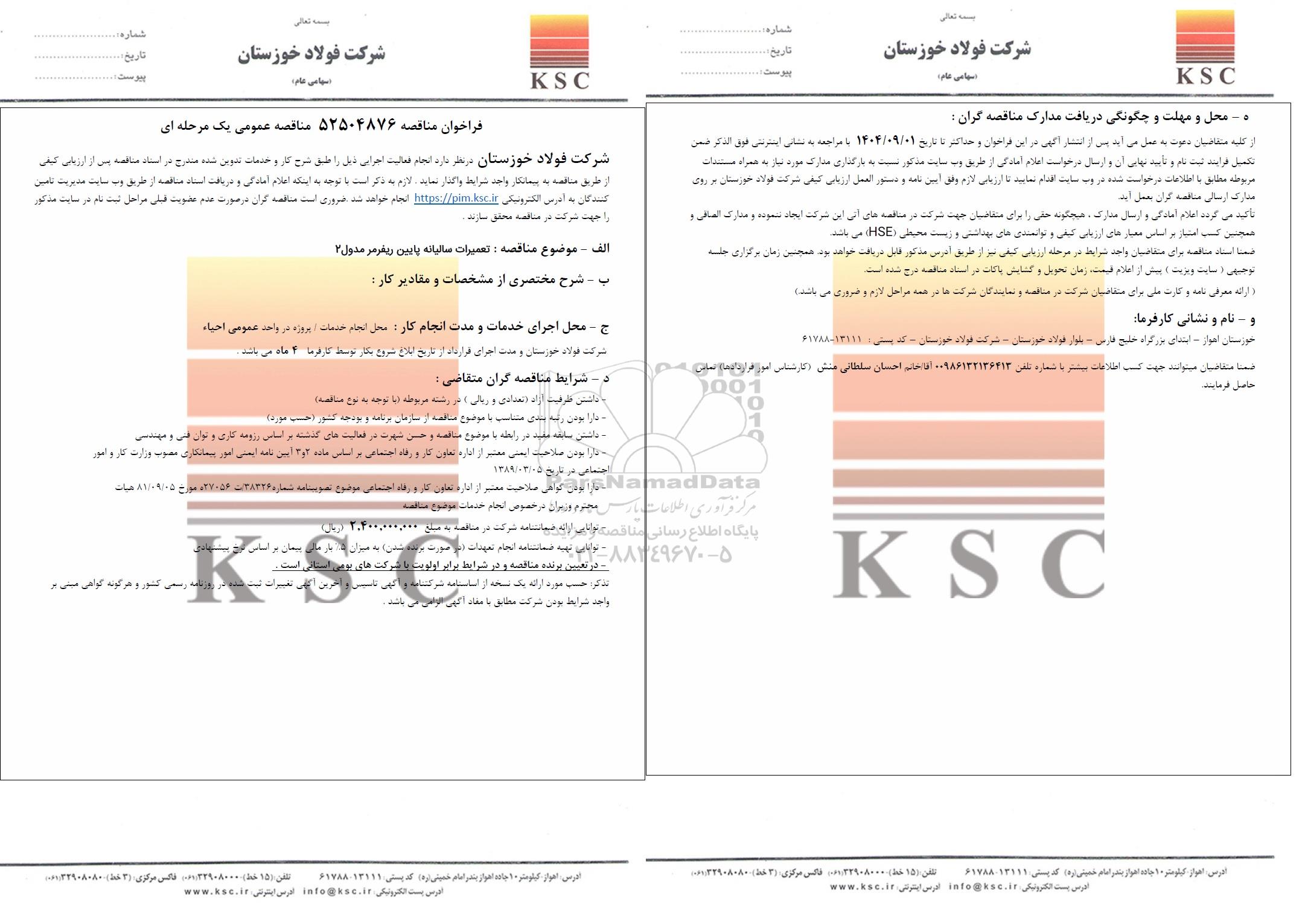 شرکت فولاد خوزستان در نظر دارد انجام فعالیت اجرایی ذیل را طبق شرح کار و خدمات تدوین شده مندرج در اسناد مناقصه پس از ارزیابی کیفی از طریق مناقصه به پیمانکار واجد شرایط واگذار نماید. لازم به ذکر است با توجه به اینکه اعلام آمادگی و دریافت اسناد مناقصه از طریق وب سایت مدیریت تامین کنندگان به آدرس الکترونیکی https://pim.ksc.ir انجام خواهد شد. ضروری است مناقصه گران در صورت عدم عضویت قبلی مراحل ثبت نام در سایت مذکور را جهت شرکت در مناقصه محقق سازند .
