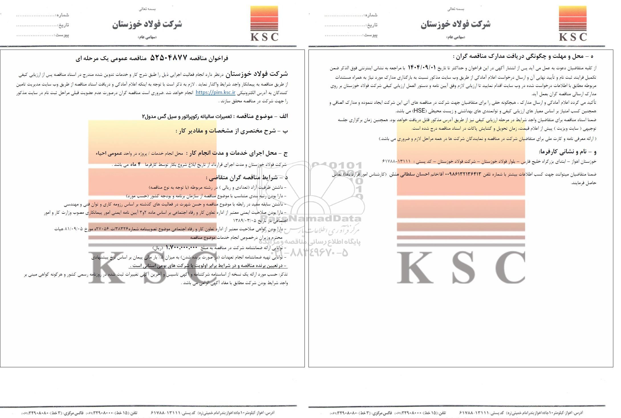 شرکت فولاد خوزستان در نظر دارد انجام فعالیت اجرایی ذیل را طبق شرح کار و خدمات تدوین شده مندرج در اسناد مناقصه پس از ارزیابی کیفی از طریق مناقصه به پیمانکار واجد شرایط واگذار نماید. لازم به ذکر است با توجه به اینکه اعلام آمادگی و دریافت اسناد مناقصه از طریق وب سایت مدیریت تامین کنندگان به آدرس الکترونیکی https://pim.ksc.ir انجام خواهد شد. ضروری است مناقصه گران در صورت عدم عضویت قبلی مراحل ثبت نام در سایت مذکور را جهت شرکت در مناقصه محقق سازند .