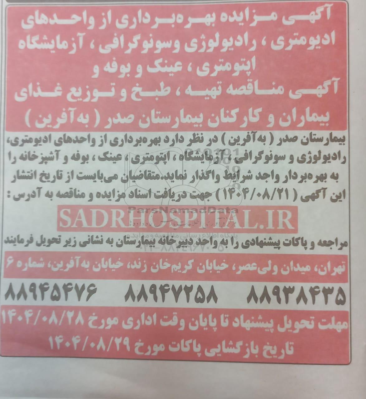 تلفن:5- 88349670 (021) فکس: 88349673 (021) Website: www.ParsNamadData.com E-mail: Info@ParsNamadData.com مزایده و مناقصه بهره برداری از واحدهای ادیومتری، رادیولوژی و سونوگرافی...