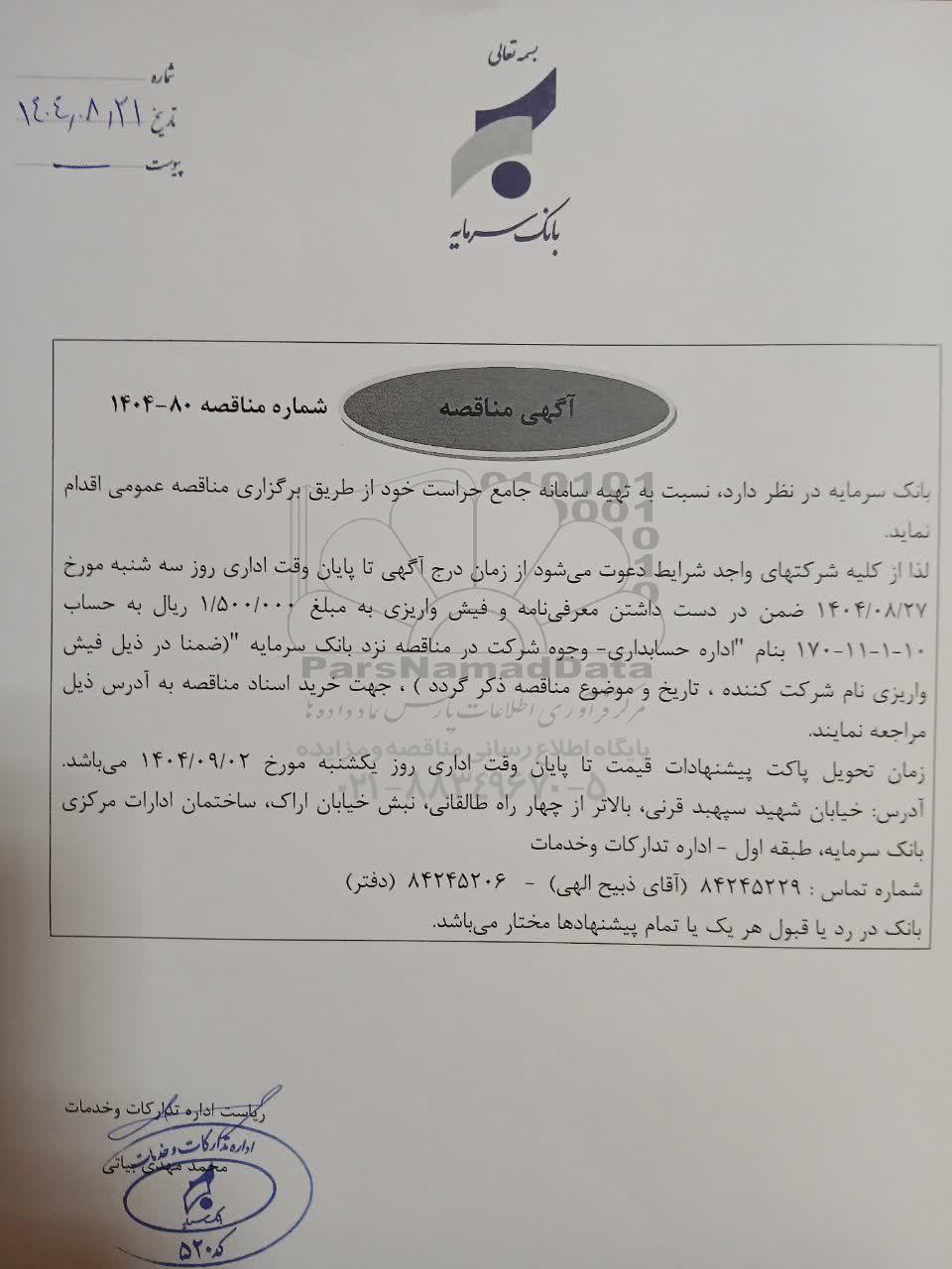 تلفن:5- 88349670 (021) فکس: 88349673 (021) Website: www.ParsNamadData.com E-mail: Info@ParsNamadData.com مناقصه تهیه سامانه جامع حراست