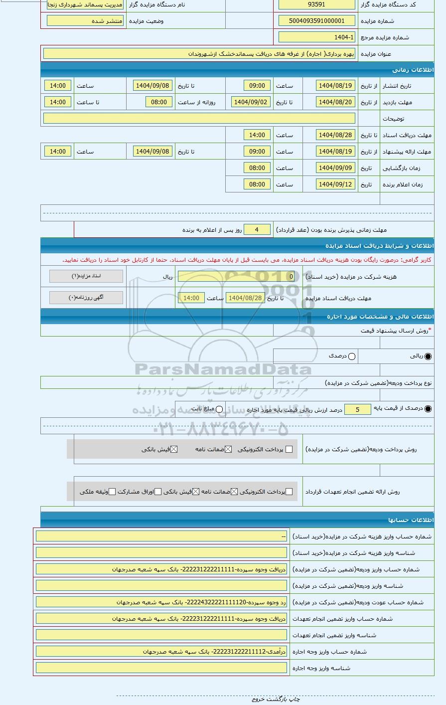 اطلاعات حسابها| شماره حساب واریز هزینه شرکت در مزایده | -- | | شناسه واریز هزینه شرکت در مزایده | | | شماره حساب واریز ودیعه | دریافت وجوه سپرده-222231222211111- بانک سپه شعبه صدرجهان | | شناسه واریز ودیعه | | | شماره حساب عودت ودیعه | رد وجوه سپرده-22224322221111120- بانک سپه شعبه صدرجهان | | شماره حساب واریز وجه مزایده | دریافت وجوه سپرده-222231222211111- بانک سپه شعبه صدرجهان | | شناسه واریز وجه مزایده | | | شماره حساب عودت وجه مزایده | درآمدی-222231222211112- بانک سپه شعبه صدرجهان | | شماره حساب عودت وجه مزایده | |