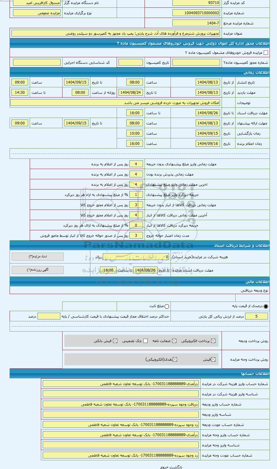 تلفن:5- 88349670 (021) فکس: 88349673 (021) Website: www.ParsNamadData.com E-mail: Info@ParsNamadData.com مزایده پمپ باد مجهز به کمپرسور دو سیلندر روغنی