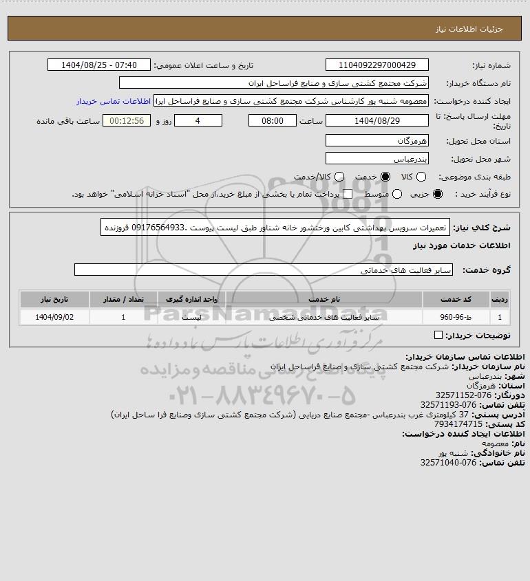 تلفن:5- 88349670 (021) فکس: 88349673 (021) Website: www.ParsNamadData.com E-mail: Info@ParsNamadData.com استعلام تعمیرات سرویس بهداشتی کابین ورختشور خانه شناور طبق لیست پیوست .09176564933 فروزنده