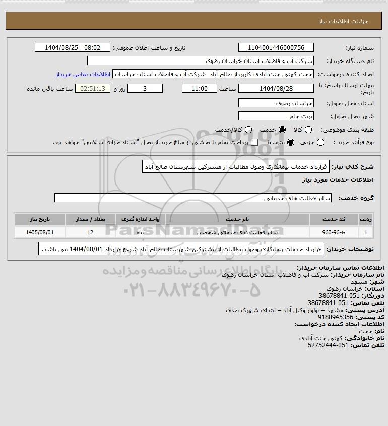 تلفن:5- 88349670 (021) فکس: 88349673 (021) Website: www.ParsNamadData.com E-mail: Info@ParsNamadData.com استعلام قرارداد خدمات پیمانکاری وصول مطالبات از مشترکین شهرستان صالح آباد