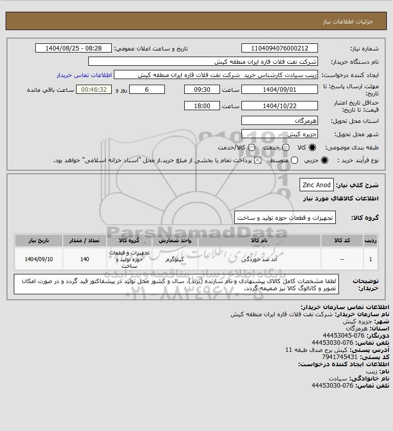تلفن:5- 88349670 (021) فکس: 88349673 (021) Website: www.ParsNamadData.com E-mail: Info@ParsNamadData.com استعلام Zinc Anod