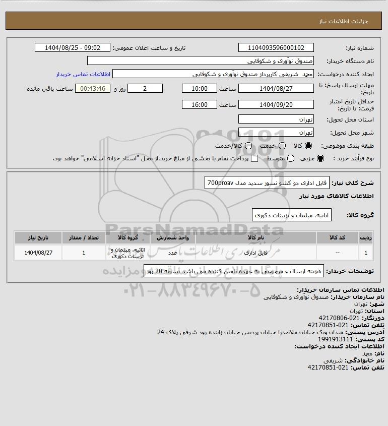 تلفن:5- 88349670 (021) فکس: 88349673 (021) Website: www.ParsNamadData.com E-mail: Info@ParsNamadData.com استعلام فایل اداری دو کشو نسوز سدید مدل 700proav