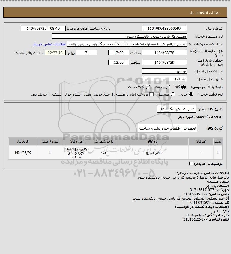 تلفن:5- 88349670 (021) فکس: 88349673 (021) Website: www.ParsNamadData.com E-mail: Info@ParsNamadData.com استعلام تامین فنر کوپلینگ 1090