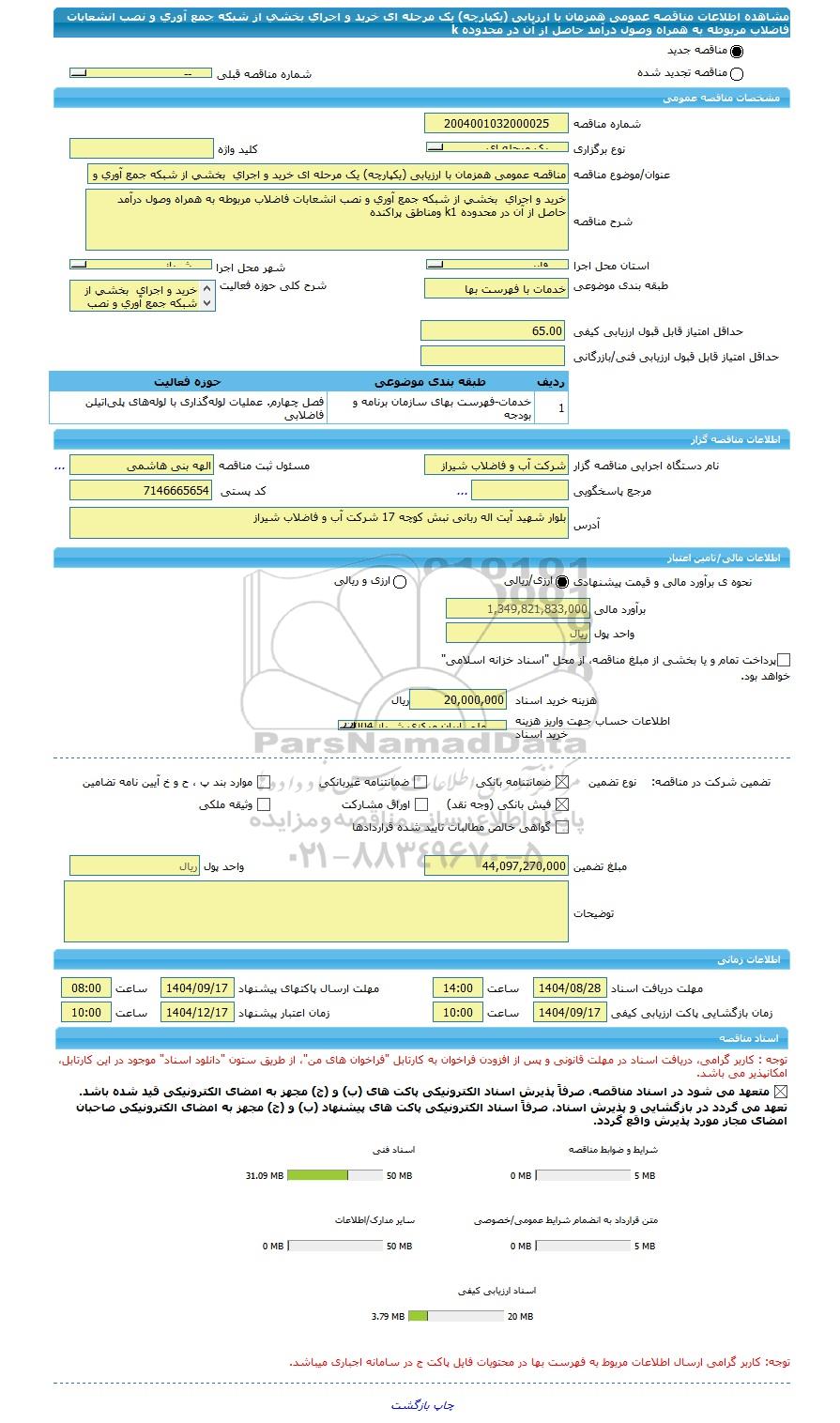 اطلاعات زمانی| مهلت دریافت اسناد | 1404/08/28 | ساعت | 14:00 | مهلت ارسال پاکتهای پیشنهاد | 1404/09/17 | ساعت | 08:00 | | زمان بازگشایی پاکت ها | 1404/09/17 | تا تاریخ | 10:00 | زمان اعتبار پیشنهاد | 1404/12/17 | تا ساعت | 10:00 |