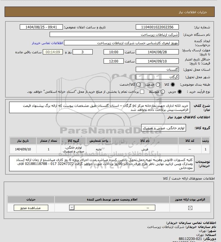تلفن:5- 88349670 (021) فکس: 88349673 (021) Website: www.ParsNamadData.com E-mail: Info@ParsNamadData.com استعلام خرید اثاثه اداری جهت نمازخانه مرکز pc گرگان – استان گلستان طبق مشخصات پیوست که ارائه برگ پیشنهاد قیمت الزامیست.پیش پرداخت داده نخواهد شد