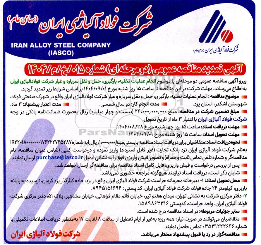 پیرو آگهی مناقصه عمومی دو مرحله ای با موضوع انجام عملیات تخلیه، بارگیری، حمل و نقل سرباره و غبار شرکت فولاد آلیاژی ایران به اطلاع می رساند، مهلت شرکت در این مناقصه تا ساعت 15 روز شنبه مورخ 1404.9.1 براساس شرایط زیر تمدید گردید.