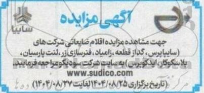 تلفن:5- 88349670 (021) فکس: 88349673 (021) Website: www.ParsNamadData.com E-mail: Info@ParsNamadData.com مزایده اقلام ضایعاتی شرکت های ( سایپاپرس، گدازقطعه، زامیاد، فنرسازی زر، لنت پارسیان، پلاسکوکار، ایدکوپرس )