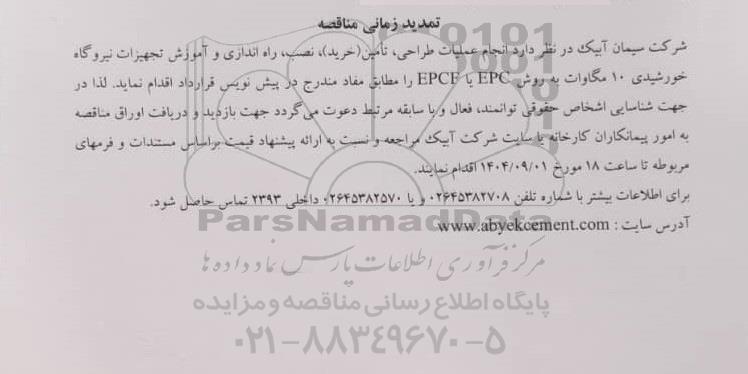 تلفن:5- 88349670 (021) فکس: 88349673 (021) Website: www.ParsNamadData.com E-mail: Info@ParsNamadData.com تمدید مناقصه انجام عملیات طراحی، تأمین (خرید)، نصب، راه اندازی و آموزش تجهیزات نیروگاه خورشیدی...