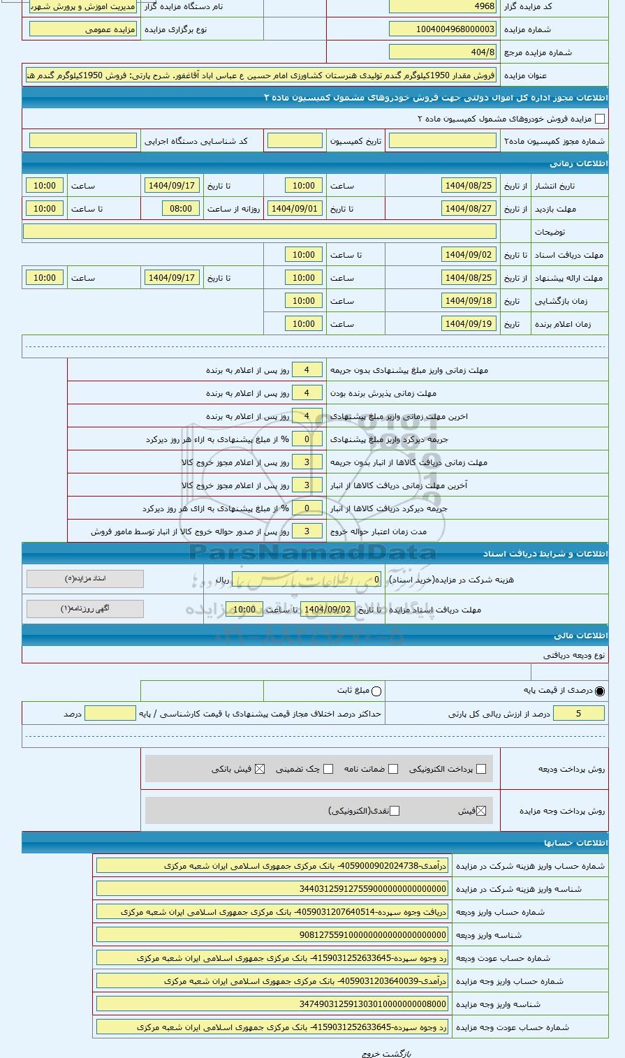 تلفن:5- 88349670 (021) فکس: 88349673 (021) Website: www.ParsNamadData.com E-mail: Info@ParsNamadData.com مزایده فروش 1950کیلوگرم گندم هنرستان کشاورزی امام حسین ع عباس اباد آقا غفور