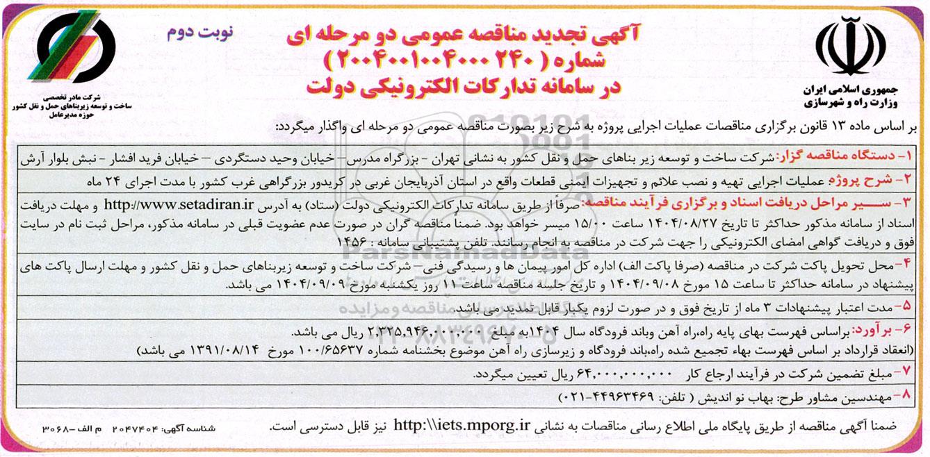 | عنوان آگهی: مناقصه عملیات اجرایی تهیه و نصب علائم و تجهیزات ایمنی تجدید نوبت دوم |