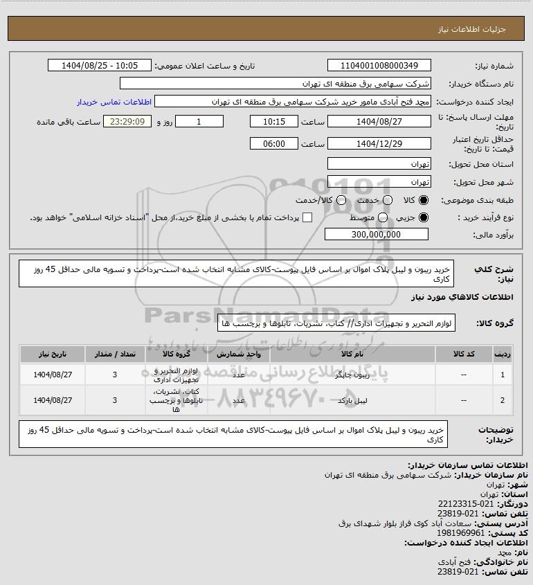 تلفن:5- 88349670 (021) فکس: 88349673 (021) Website: www.ParsNamadData.com E-mail: Info@ParsNamadData.com استعلام خرید ریبون و لیبل پلاک اموال بر اساس فایل پیوست-کالای مشابه انتخاب شده است-پرداخت و تسویه مالی حداقل 45 روز کاری