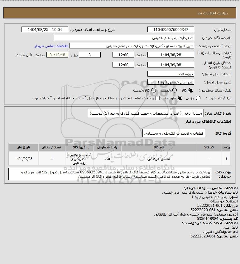 تلفن:5- 88349670 (021) فکس: 88349673 (021) Website: www.ParsNamadData.com E-mail: Info@ParsNamadData.com استعلام وسایل برقی ( تعداد مشخصات و جهت قیمت گذاری به پنج (5) پیوست)