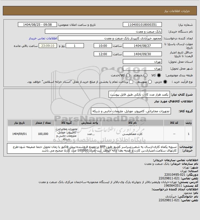 تلفن:5- 88349670 (021) فکس: 88349673 (021) Website: www.ParsNamadData.com E-mail: Info@ParsNamadData.com استعلام یکصد هزار عدد کارت بانکی طبق فایل پیوست