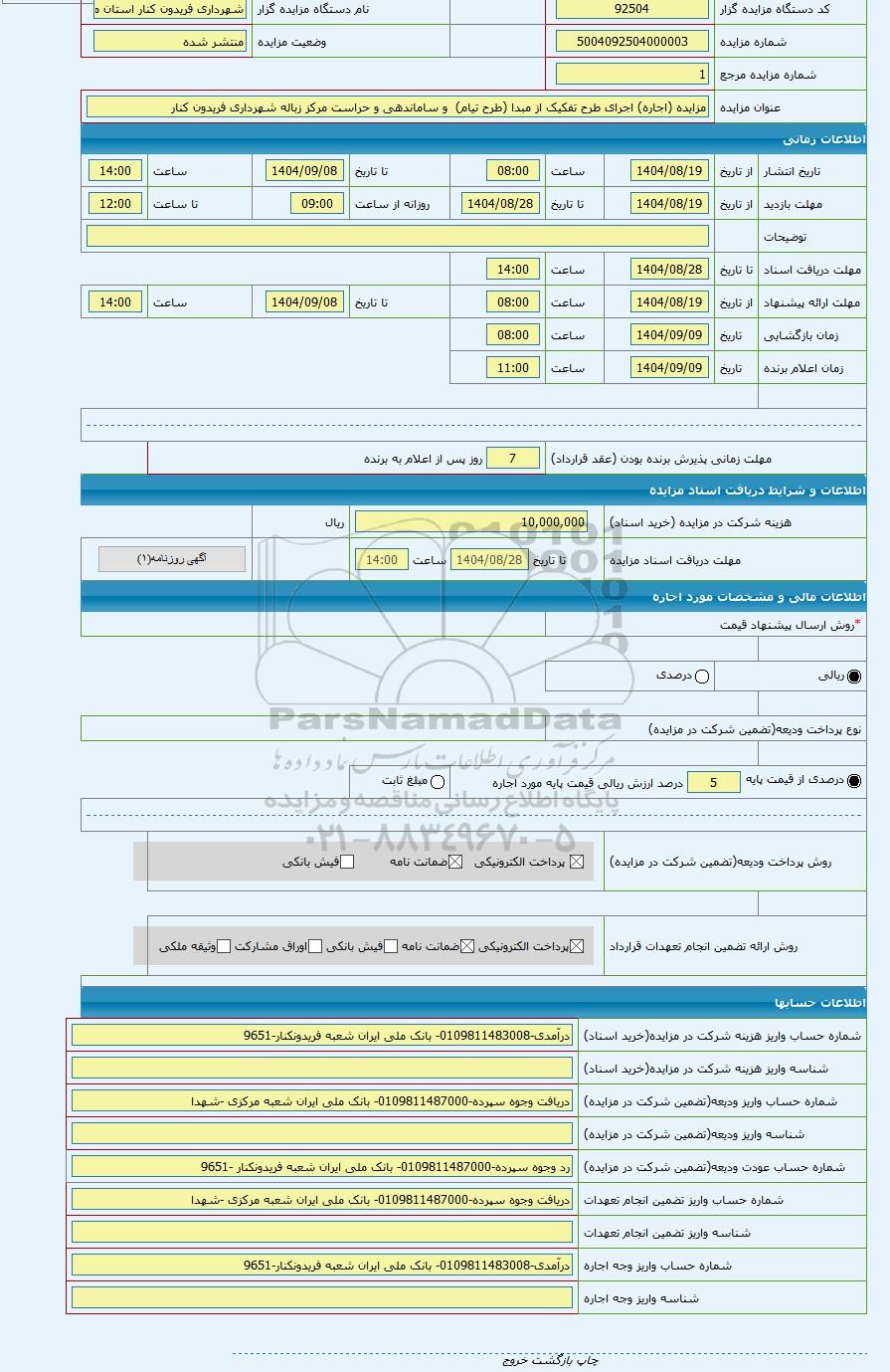 جزئیات آگهی| کد مزایده گزار | 92504 | | نام دستگاه مزایده گزار | شهرداری فریدون کنار استان مازندران | | شماره مزایده | 5004092504000003 | | | | | شماره مورد اجاره | 5104092504000010 | | نوع برگزاری مزایده |