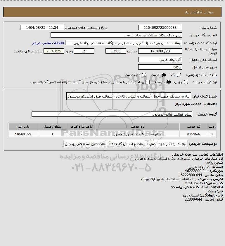 تلفن:5- 88349670 (021) فکس: 88349673 (021) Website: www.ParsNamadData.com E-mail: Info@ParsNamadData.com استعلام نیاز به پیمانکار جهت حمل آسفالت و اساس کارخانه آسفالت طبق استعلام پیوستی