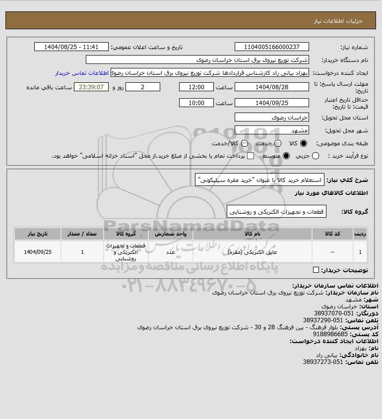 تلفن:5- 88349670 (021) فکس: 88349673 (021) Website: www.ParsNamadData.com E-mail: Info@ParsNamadData.com استعلام استعلام خرید کالا با عنوان "خرید مقره سیلیکونی"