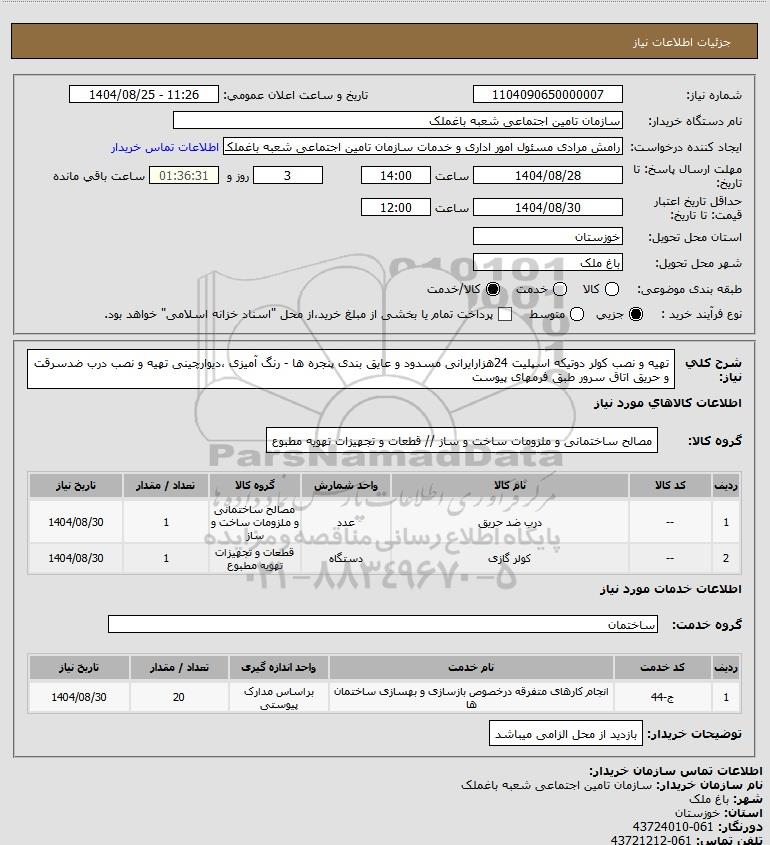 تلفن:5- 88349670 (021) فکس: 88349673 (021) Website: www.ParsNamadData.com E-mail: Info@ParsNamadData.com استعلام تهیه و نصب کولر دوتیکه اسپلیت 24هزارایرانی مسدود و عایق بندی پنجره ها - رنگ آمیزی دیوارچینی تهیه و نصب درب ضدسرقت و حریق اتاق سرور طبق فرمهای پیوست
