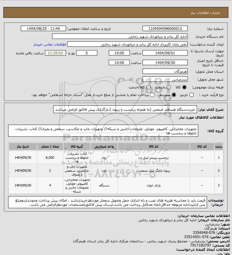 تلفن:5- 88349670 (021) فکس: 88349673 (021) Website: www.ParsNamadData.com E-mail: Info@ParsNamadData.com استعلام خریددستگاه هندهلد صنعتی (به همراه برچسب و ریبون )بارگذاری پیش فاکتور الزامی میباشد