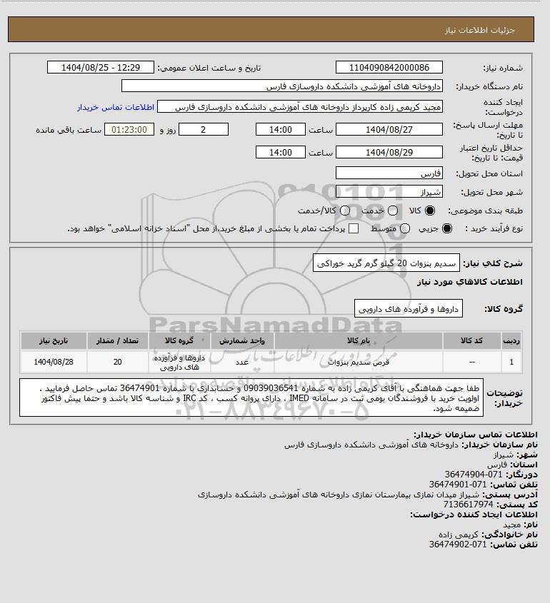 تلفن:5- 88349670 (021) فکس: 88349673 (021) Website: www.ParsNamadData.com E-mail: Info@ParsNamadData.com استعلام سدیم بنزوات 20 گیلو گرم گرید خوراکی