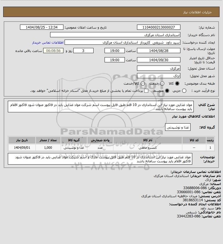 تلفن:5- 88349670 (021) فکس: 88349673 (021) Website: www.ParsNamadData.com E-mail: Info@ParsNamadData.com استعلام مواد غذایی مورد نیاز این استانداری در 10 قلم طبق فایل پیوست