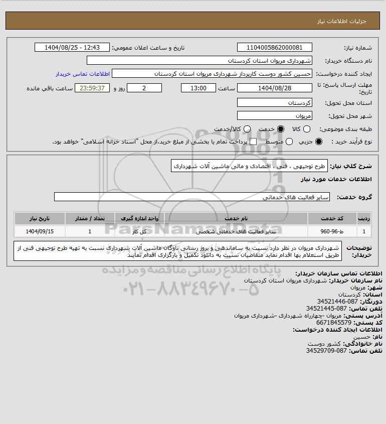 شرح کلی نیاز: طرح توجیهی ، فنی ، اقتصادی و مالی ماشین آلات شهرداری