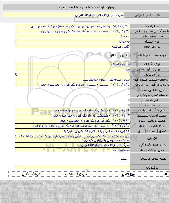 تلفن:5- 88349670 (021) فکس: 88349673 (021) Website: www.ParsNamadData.com E-mail: Info@ParsNamadData.com مناقصه خرید ۳۵۰۰ دستگاه کنتور آب خانگی به شماره فراخوان: ۲۰۰۴۰۰۵۳۹۰۰۰۰۱۰۱ (مناقصه عمومی با ارزیابی کیفی)