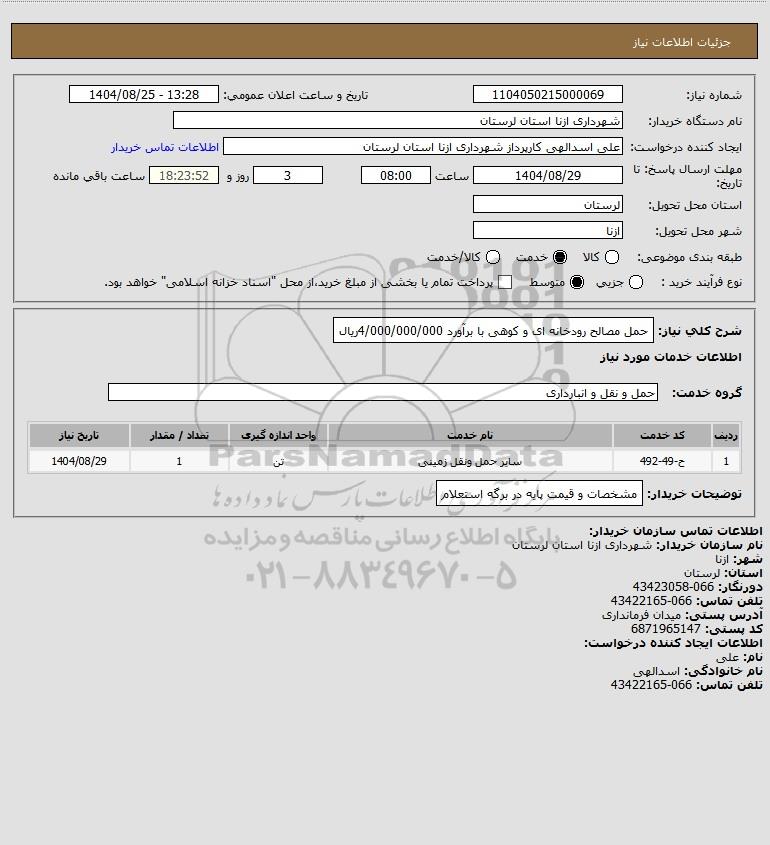 تلفن:5- 88349670 (021) فکس: 88349673 (021) Website: www.ParsNamadData.com E-mail: Info@ParsNamadData.com استعلام حمل مصالح رودخانه ای و کوهی با برآورد 4/000/000/000ریال